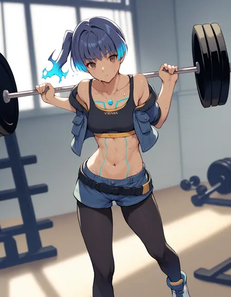 outfit:black sports bra, chest jewel, crop top, leggings, navel, shorts, shoulder strap