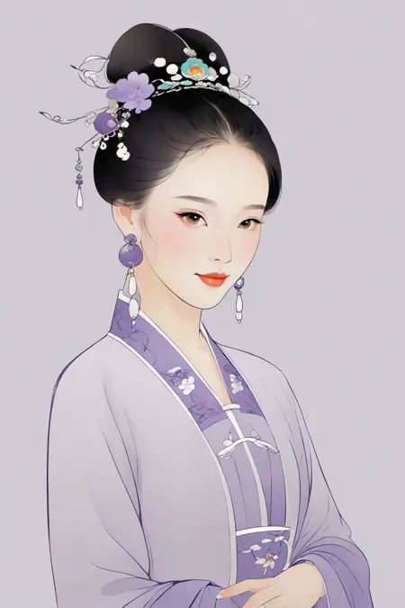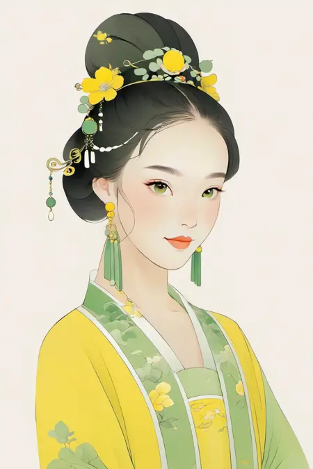 正向:(chinese traditional minimalism:1.3), Close-up Portrait, Left View, Chinese enchanting Maiden, Charming smile, solo, 1girl, beautiful, elegant, pale yellow color matching, white background, hair accessories, earrings,