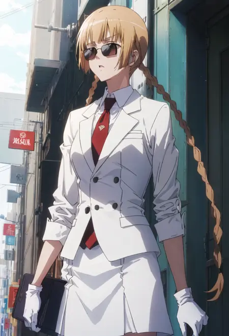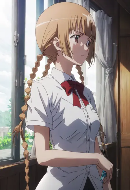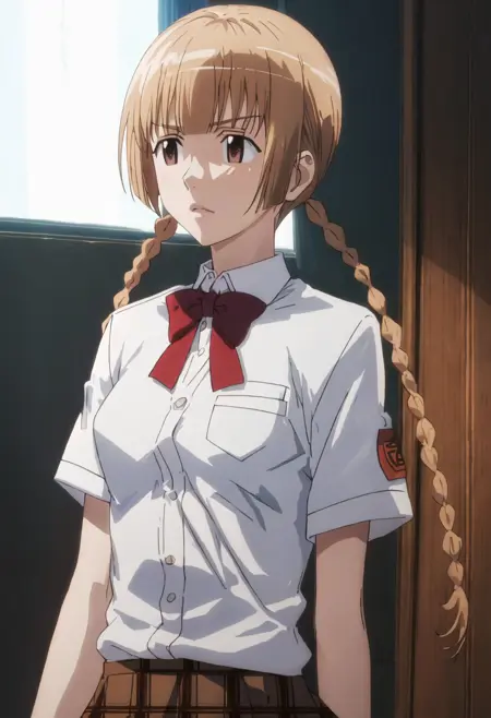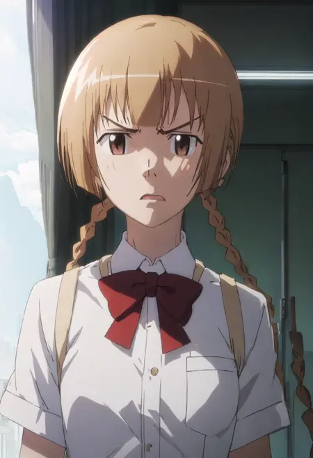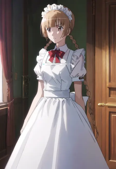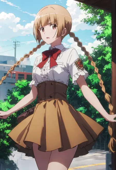 削減されたキャラクタータグは、brown_hair、braid、twin_braids、long_hair、brown_eyes、bowです。キャラクターの主要な特徴(例:髪の色)が安定しない場合、これらのタグをプロンプトに追加してください。