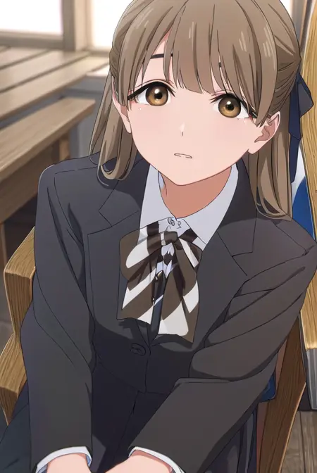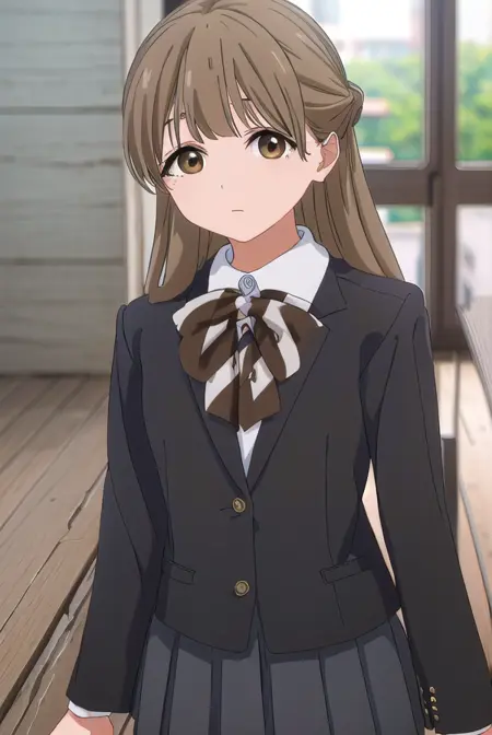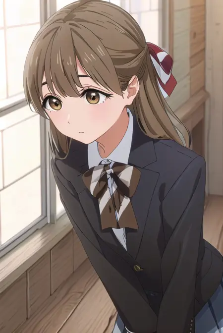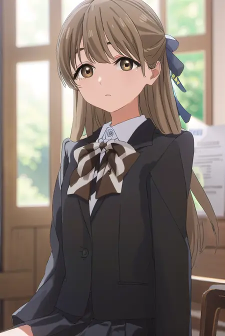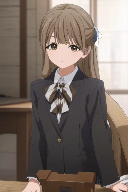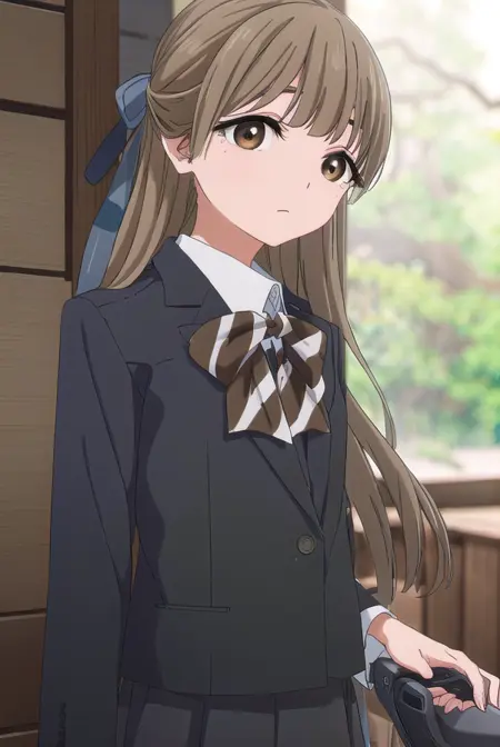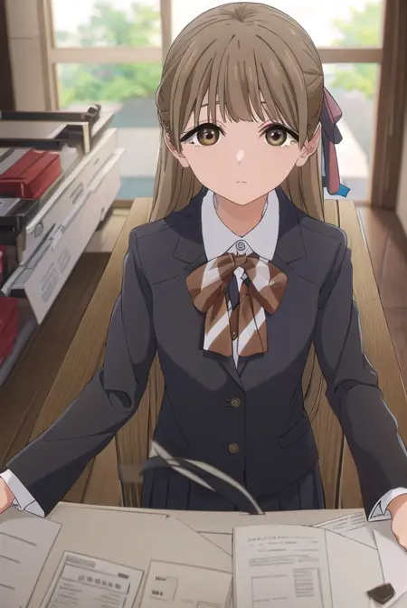 yasuko nawashiro, long hair, brown hair, bow, ribbon, (brown eyes:1.5), hair bow, mole, mole under eye, half updo