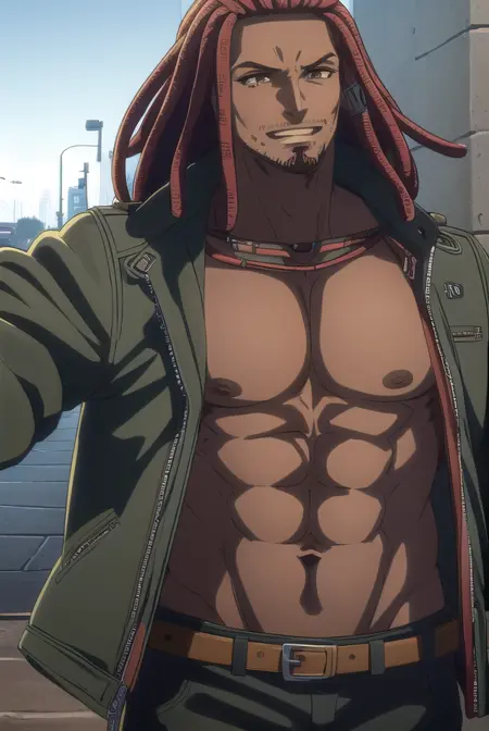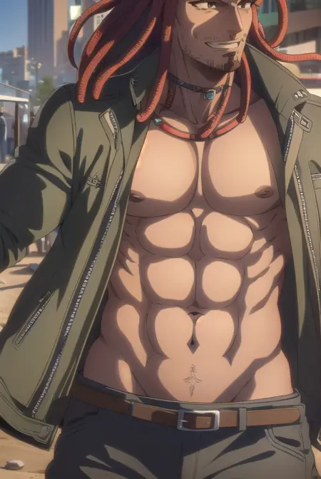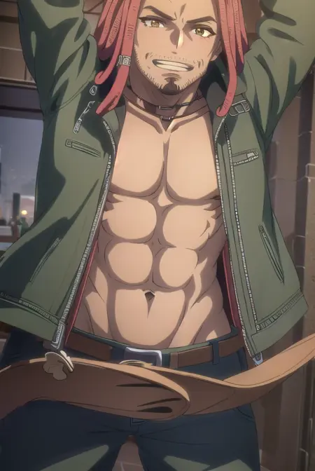 배꼽, 재킷, 벌어진 옷, 벨트, 바지, 벌어진 재킷, 복근, 녹색 재킷,