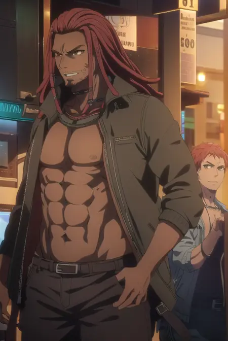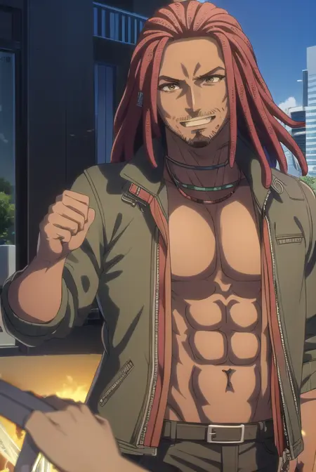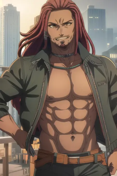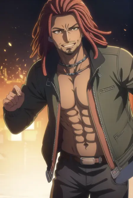 격투가, (갈색 눈:1.5), 남성 중심, 붉은 머리카락, 안면 수염, 머리관,
