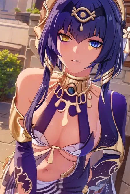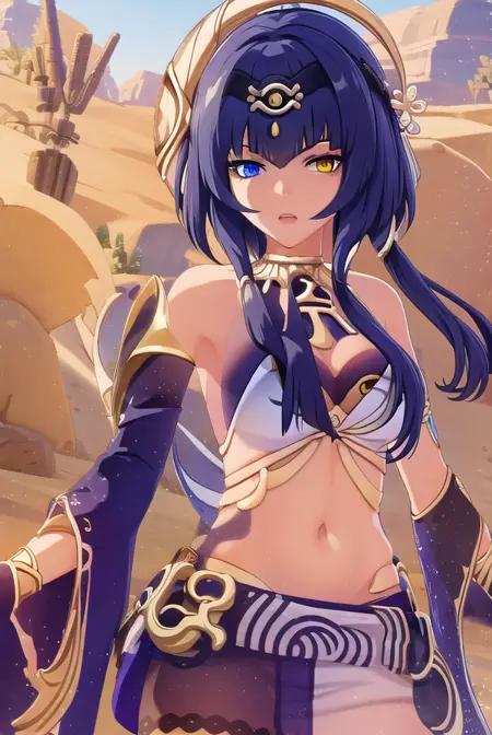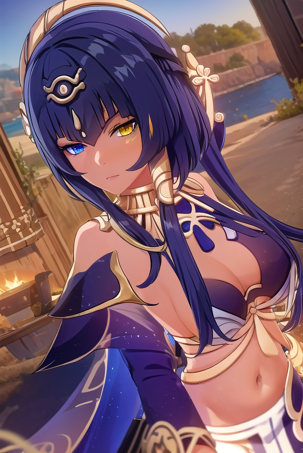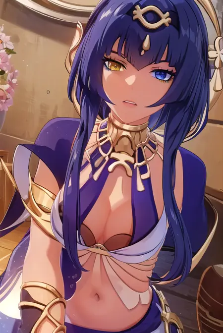 candace, bangs, blue eyes, hair ornament, blue hair, (yellow eyes:1.3), sidelocks, dark skin, dark-skinned female, (heterochromia:1.5), short hair with long locks, eye of horus,