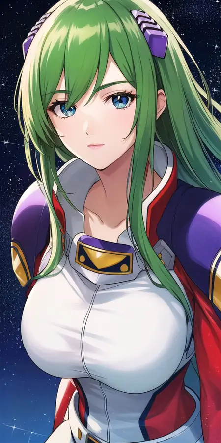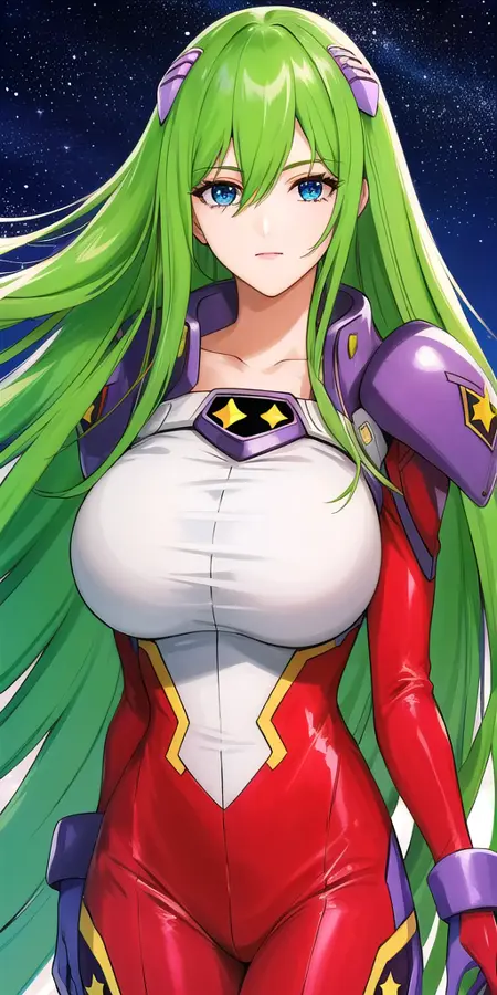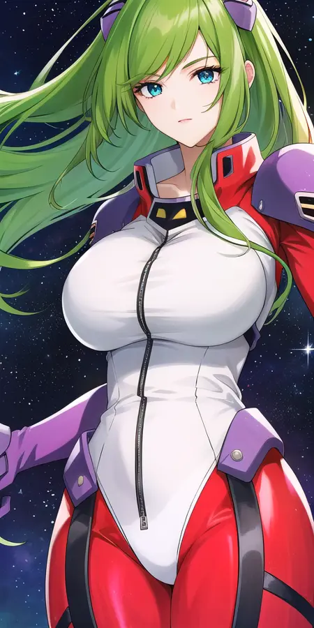 - Red_pilot_suit_White_bustier_Purple_shoulder_pads_High_collar: 그녀의 조종복.