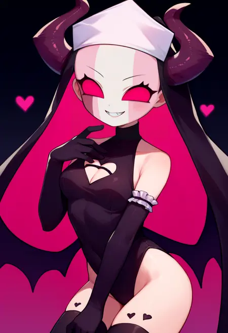 Gospel: habit, horns, pink eyes, no pupils, black leotard, heart cutout, black gloves, elbow gloves, black thighhighs, demon wings