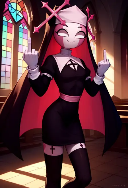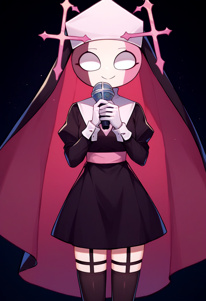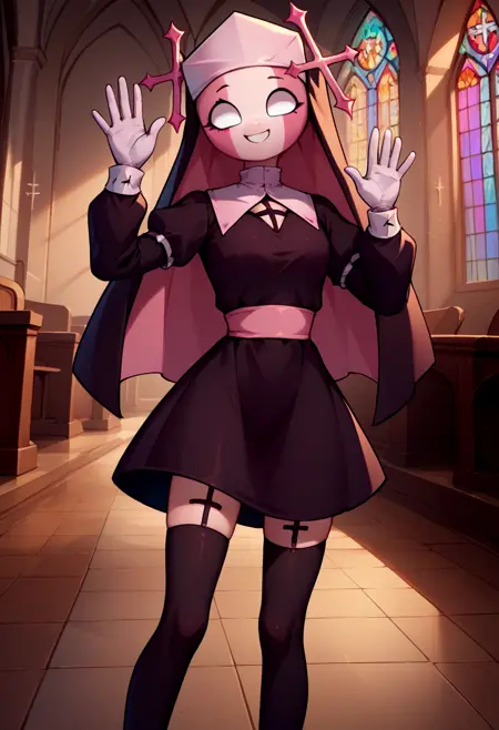Parish: habit, blank eyes, nun, black dress, long sleeves, white gloves, black thighhighs