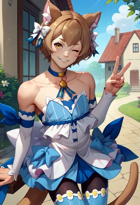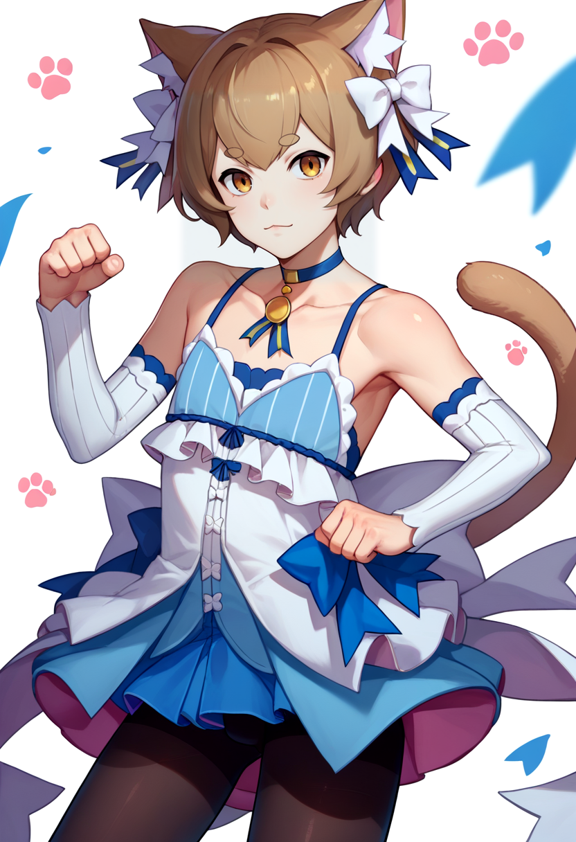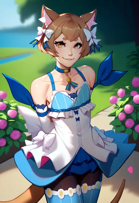 Default Outfit: hair bow, dress, striped, ribbon, detached sleeves, pantyhose, blue choker, tail, collarbone, bare shoulders