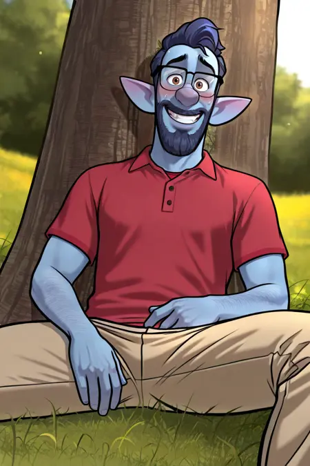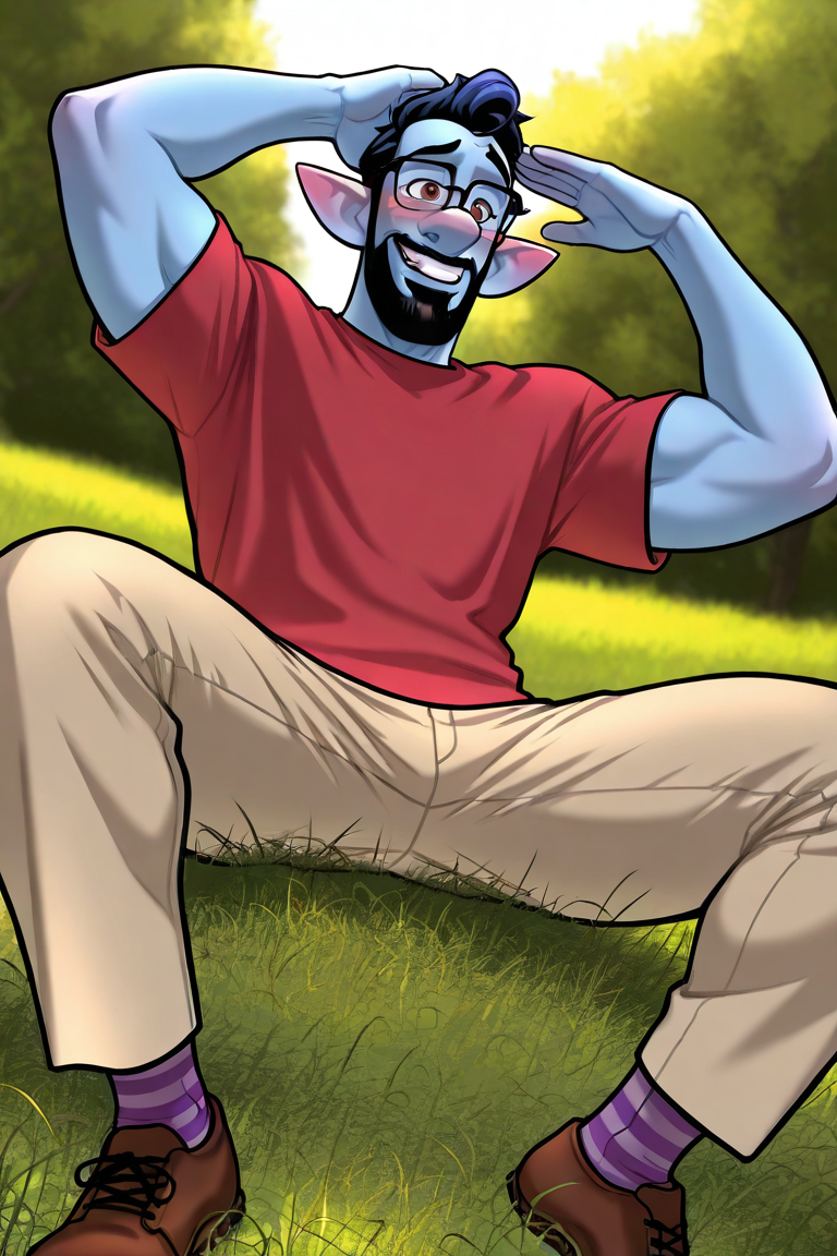 Prompt: Wilden Lightfoot, elf, (complete-skinned, colored skin), dark blue hair, short hair, brown eyes, thick eyebrows, pointy ears, facial hair, (full beard), black-framed glasses, completely red t-shirt, khaki shorts