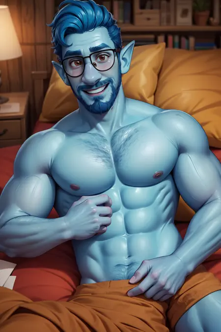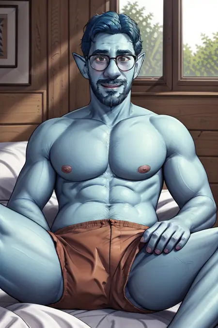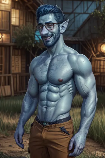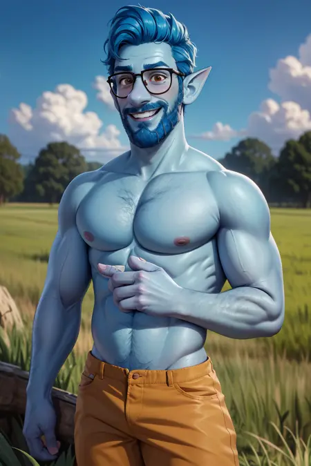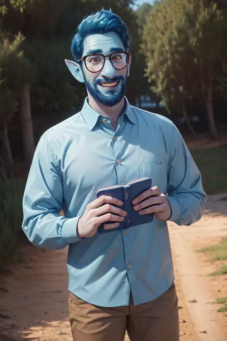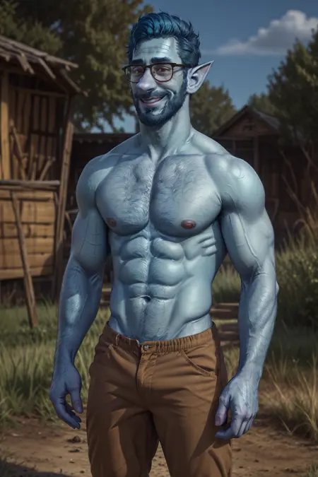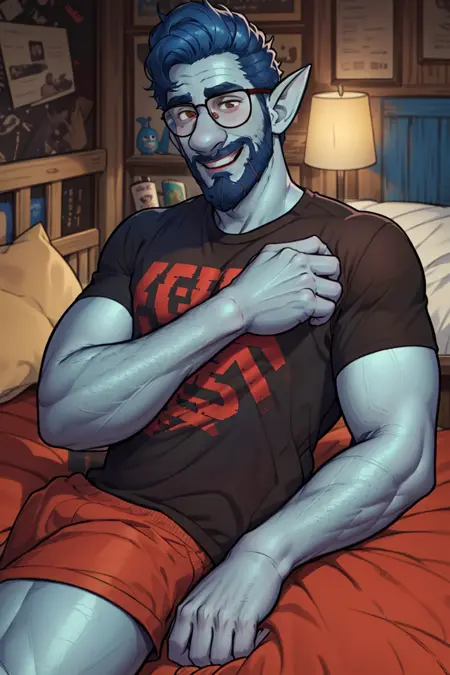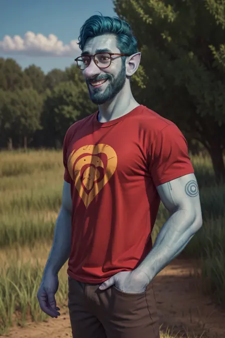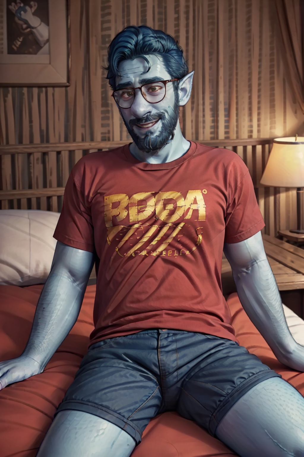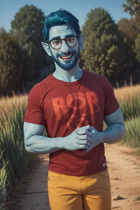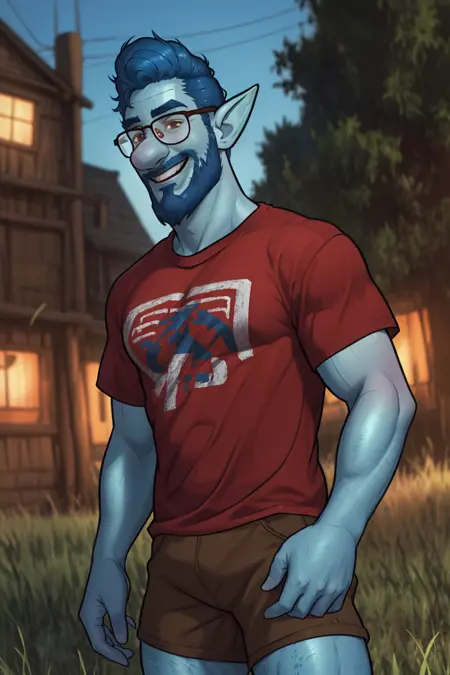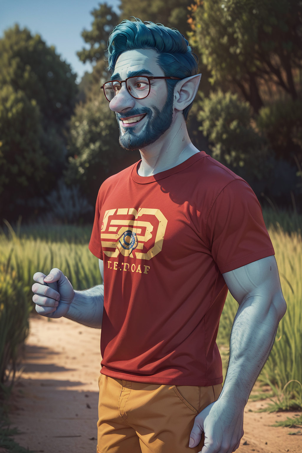 Prompt: Wilden Lightfoot, elf, (complete-skinned, colored skin), dark blue hair, short hair, brown eyes, thick eyebrows, pointy ears, facial hair, (full beard), black-framed glasses, completely red t-shirt, khaki shorts