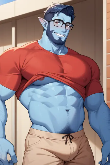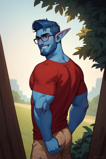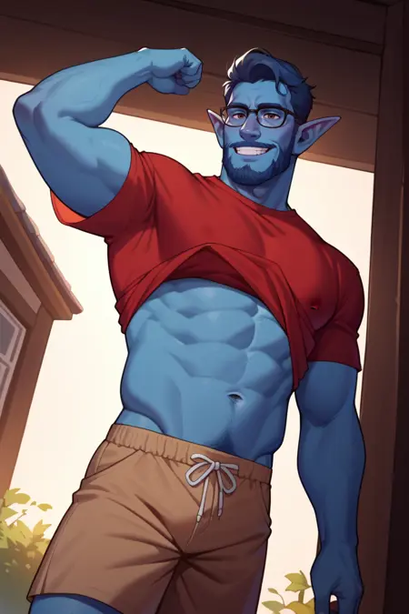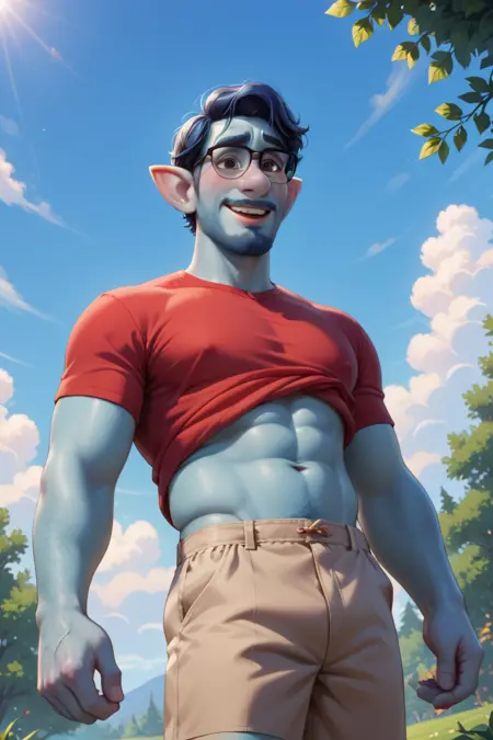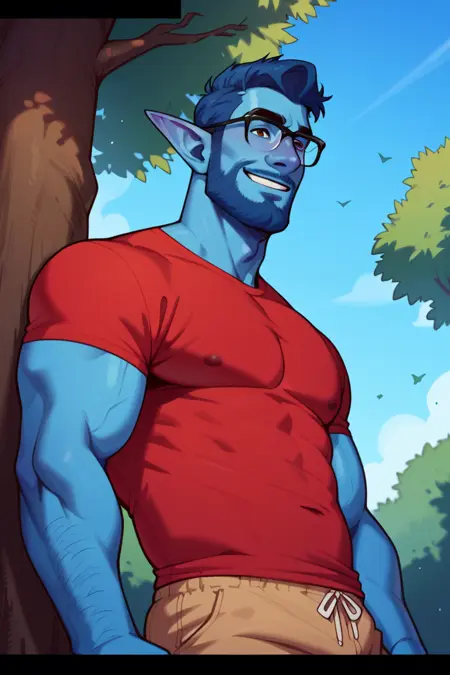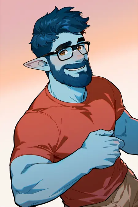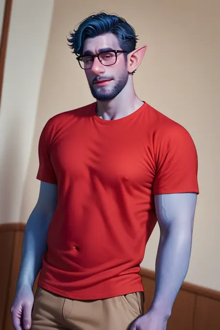 Prompt: Wilden Lightfoot, elf, (complete-skinned, colored skin), dark blue hair, short hair, brown eyes, thick eyebrows, pointy ears, facial hair, (full beard), black-framed glasses, completely red t-shirt, khaki shorts