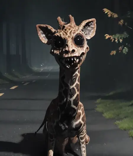 tag:smile cat,animal,crazy smile,black lips,black mouth,BLACK EYES,no_pupils,nostrils,white_fur,long neck,alpaca,monster,dark,horror \(theme\),