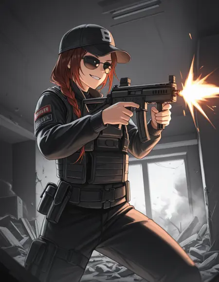 as5s1eg, 빨간 머리, 갈색 머리, 야구 모자, 선글라스, 검정 재킷, 검정 셔츠, 긴 소매, 방탄복