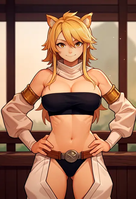 Default Appearance: agkleone, short hair, black tube top, bandeau, detached sleeves, white pants, belt, underwear, black panties, white scarf
