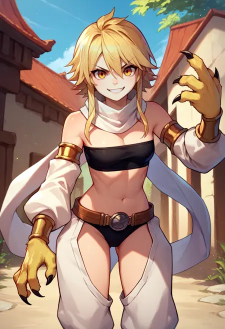 Transformed: agkleone, animal hands, claws, long hair, animal ears, black tube top, bandeau, detached sleeves, white pants, belt, underwear, black panties, white scarf