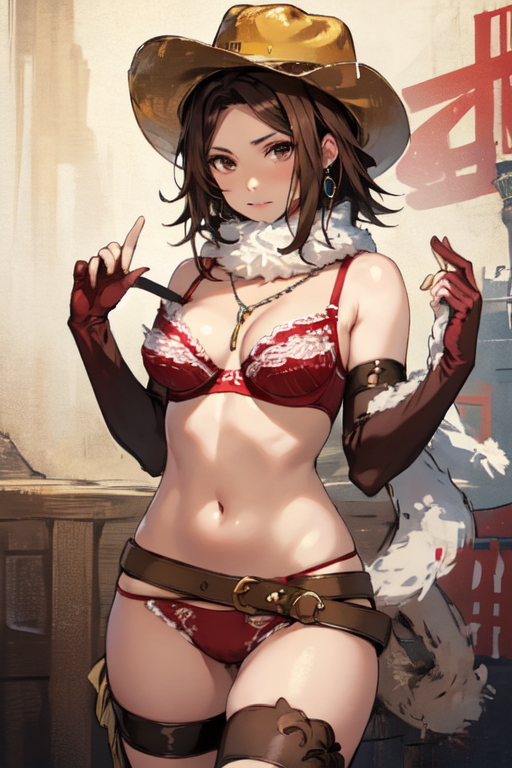 AyaOnechanbara, 1girl, solo, short hair, brown hair, thighhighs, elbow gloves, hat, navel, cleavage, brown eyes, jewelry, medium breasts, panties, bikini, belt, necklace, scarf, red bra, thigh strap, single thighhigh, red bra, cowboy hat,