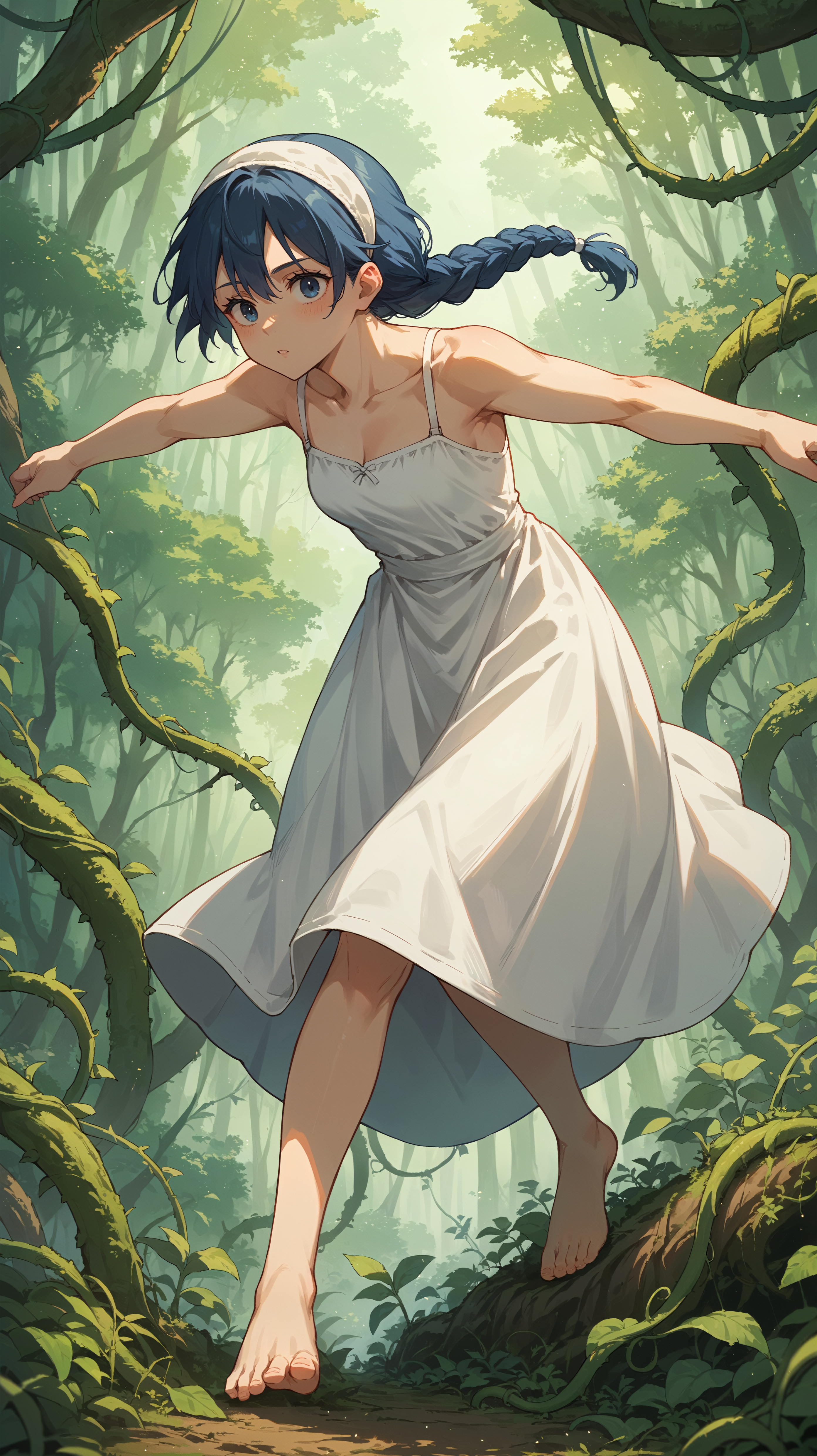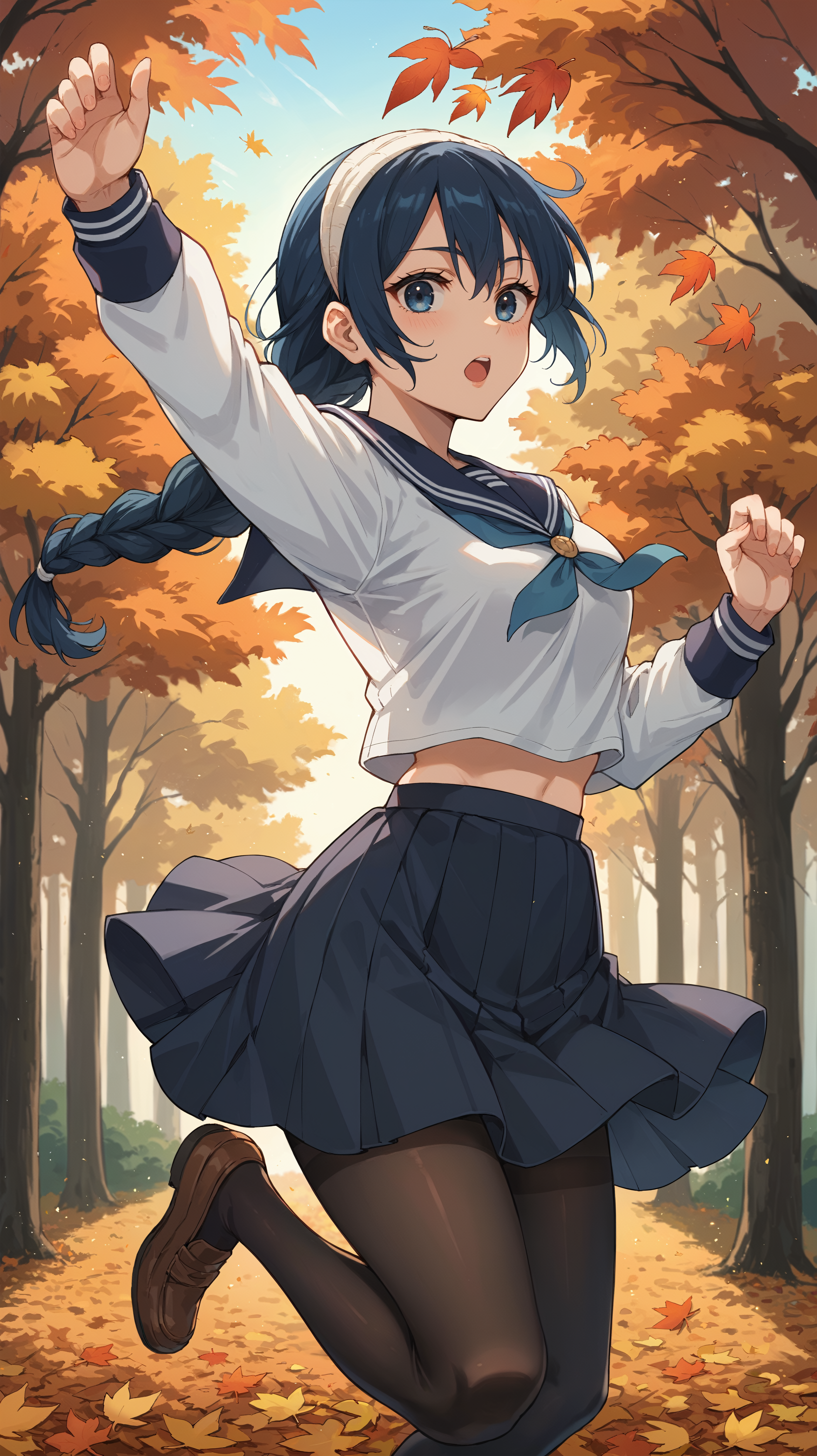 dark blue hair, single braid, blue eyes, school uniform, white serafuku, white hairband, blue pleaded skirt, pantyhose,