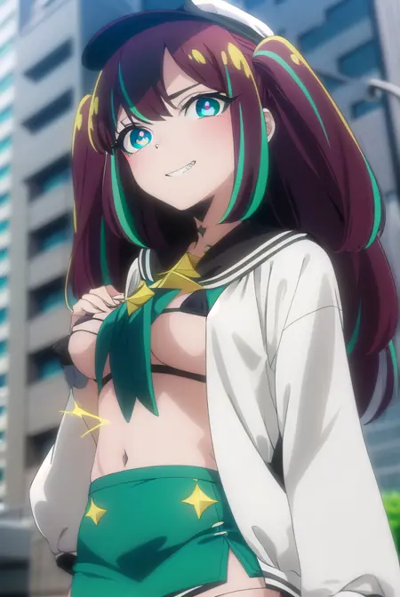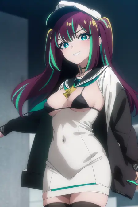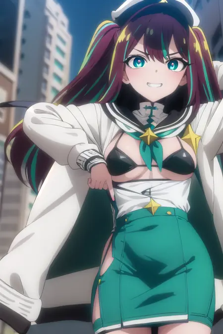 スカート、タイツ、ロングスリーブ、帽子、ジャケット、水着、ビキニ、オープンな服、黒タイツ、セーラー collar、星\(記号\)、ネイルポリッシュ、ネッカチーフ、黒ビキニ、白い頭部装飾、(ビキニトップのみ:1.5)、(白いジャケット:1.5)、(緑のスカート:1.5)、ペンシルスカート、(緑のペンシルスカート:1.5)、おへそカバー
