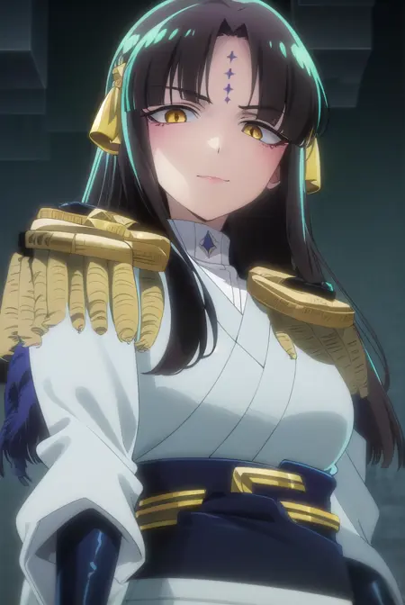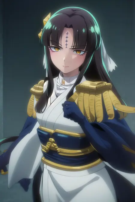 michiko tanaka, long hair, black hair, (yellow eyes:1.3), facial mark, forehead mark,