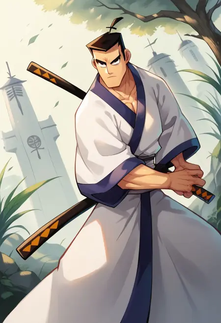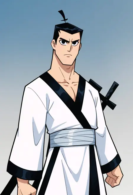 Prompt: Berjack, black hair, short hair, samurai topknot, single topknot, black eyes, japanese clothing, white kimono with grey accents, wide sleeves, white Nagajuban \(japanese clothing\), geta, Jack's Katana \(Samurai Jack\),