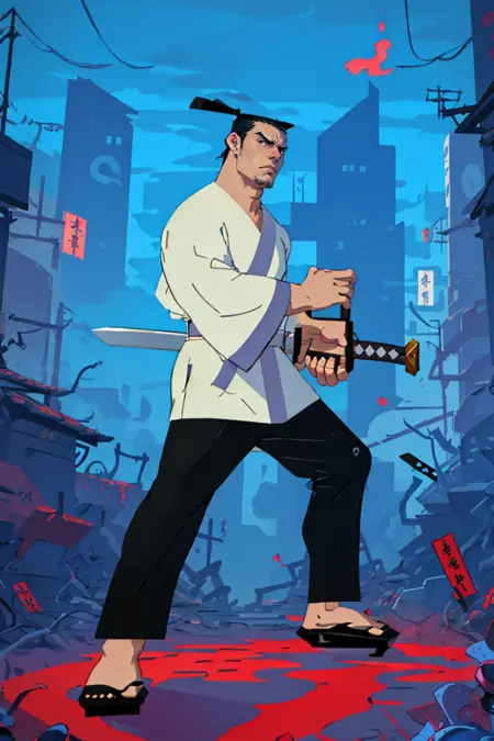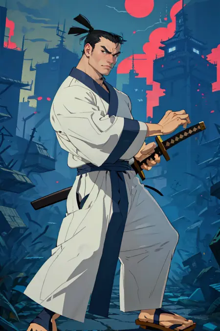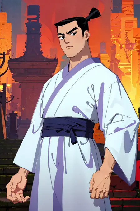 Prompt: Berjack, black hair, short hair, samurai topknot, single topknot, black eyes, japanese clothing, white kimono with grey accents, wide sleeves, white Nagajuban \(japanese clothing\), geta, Jack's Katana \(Samurai Jack\),