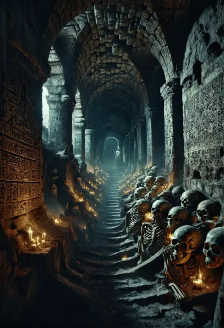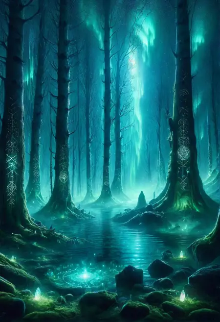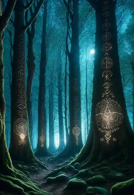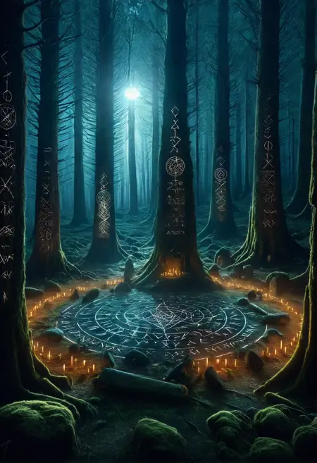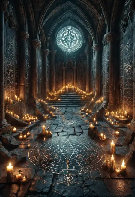 Scenes should feel isolated or secretive, such as dense forests at night, ancient ruins, or candle-lit interiors of stone cottages and grand halls. The sense of an unseen world or the edge of reality enhances the satanic or witch-like vibe.