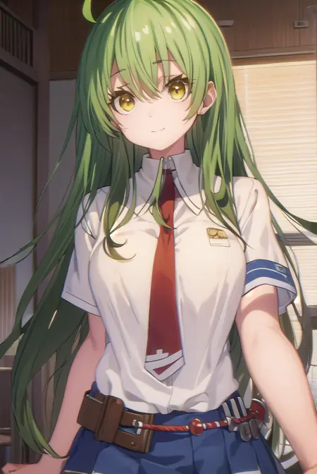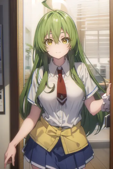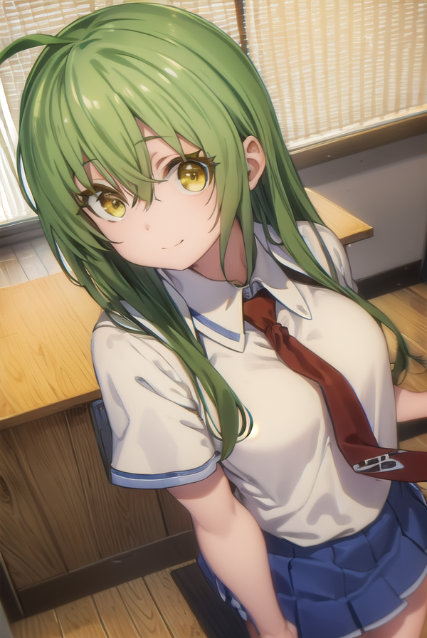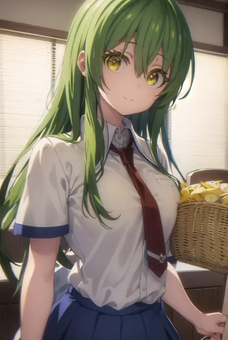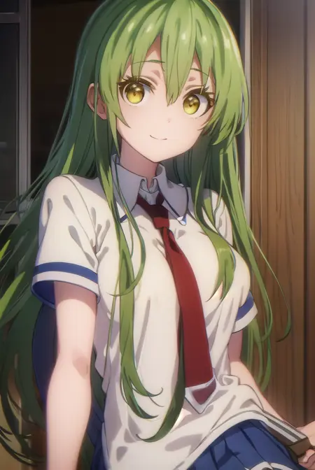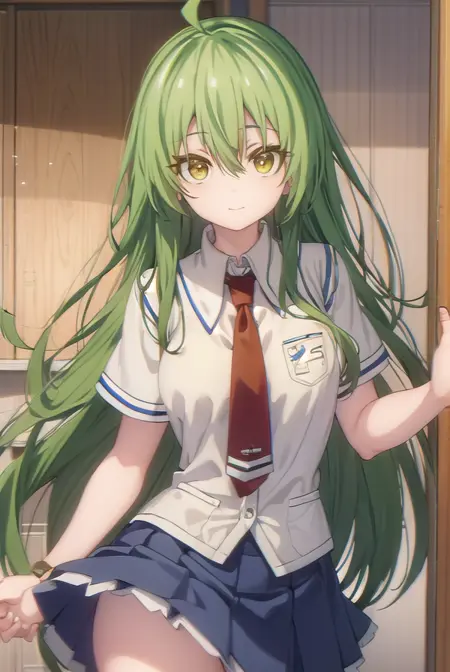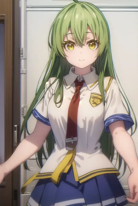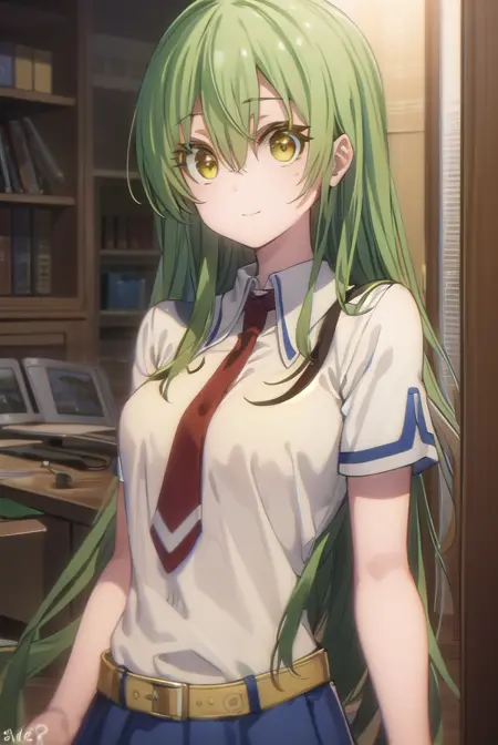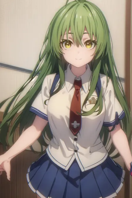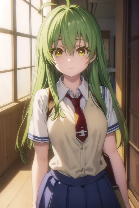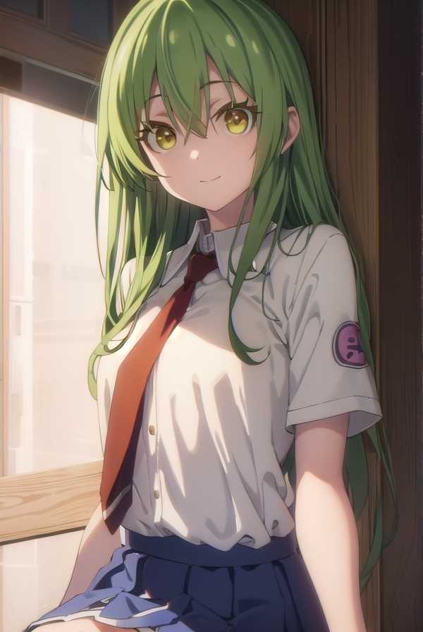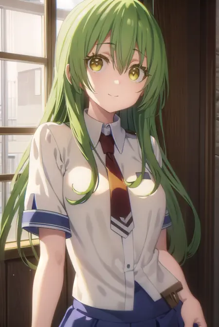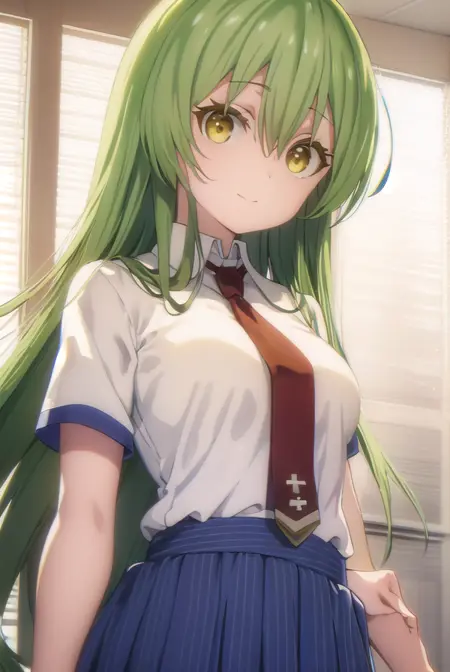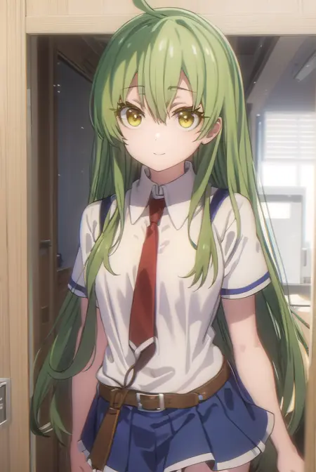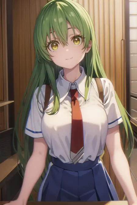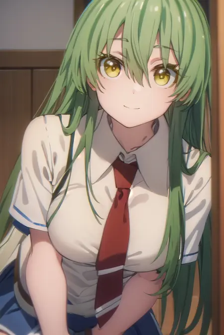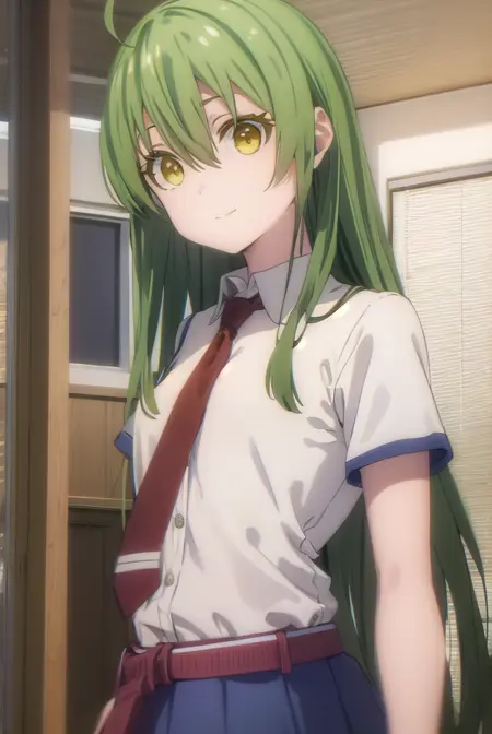 satori tamaba, long hair, hair between eyes, (yellow eyes:1.3), green hair, ahoge,