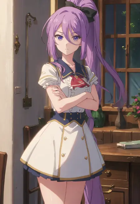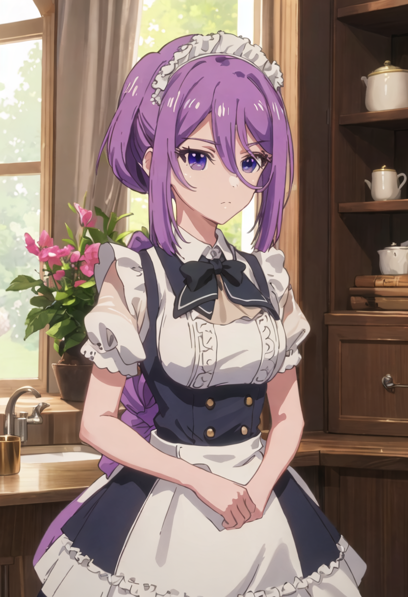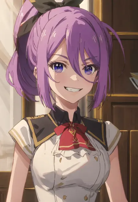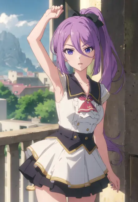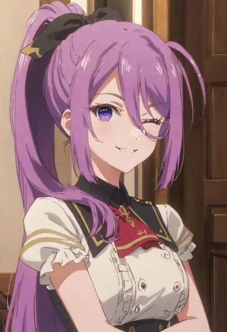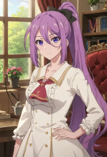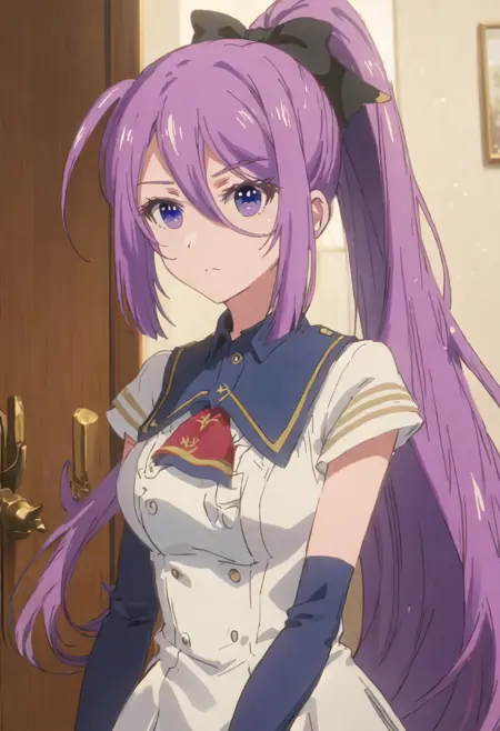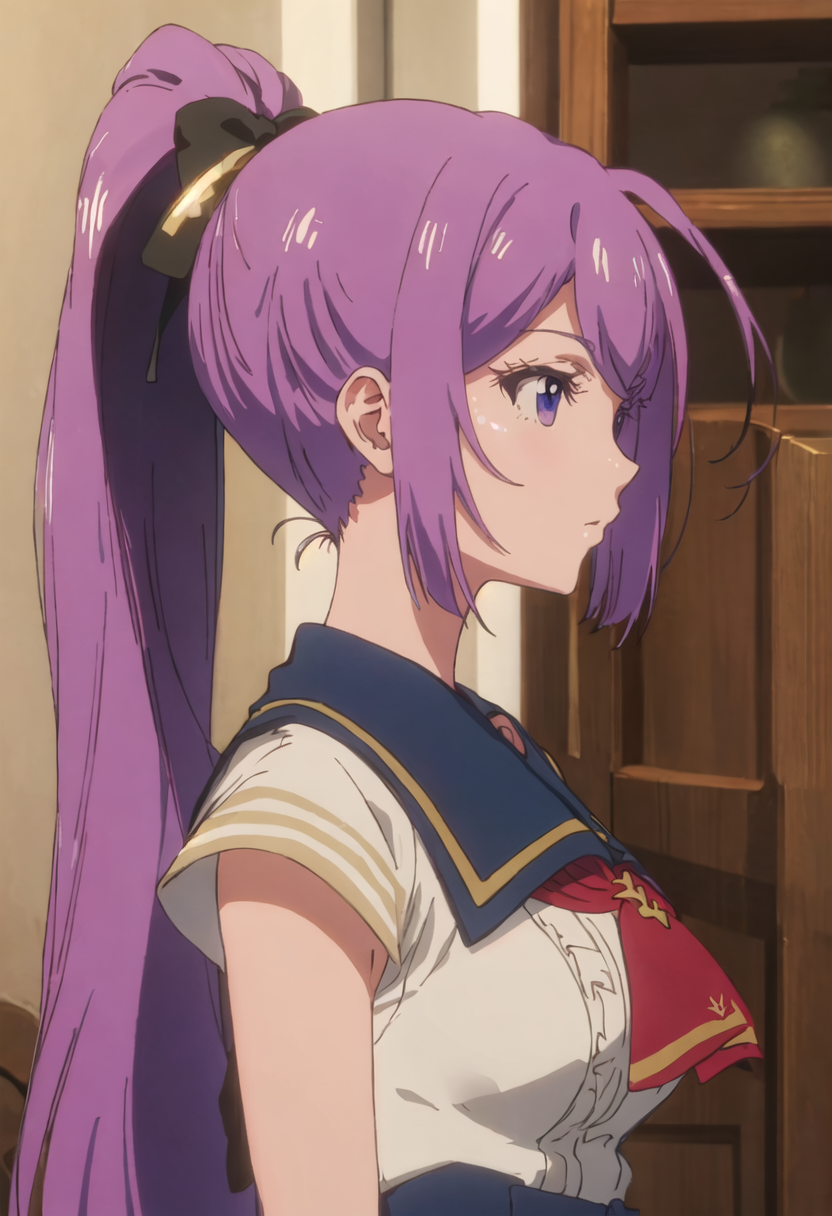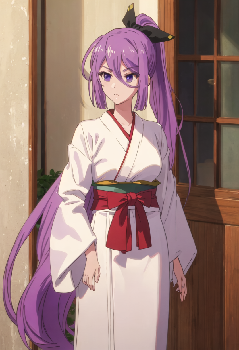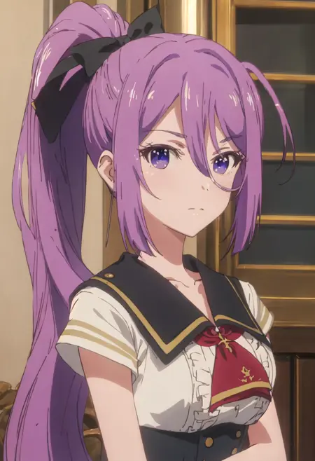 - The pruned character tags are purple_hair, long_hair, hair_between_eyes, ponytail, purple_eyes, bangs, bow, hair_bow, very_long_hair. You can add them into prompts when core features (e.g. hair color) of character is not so stable.