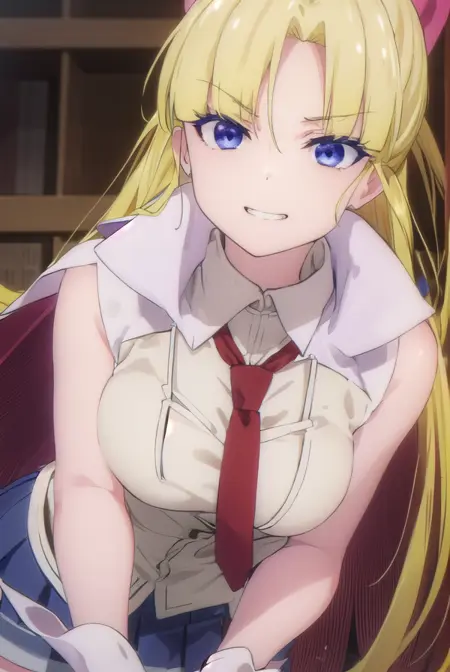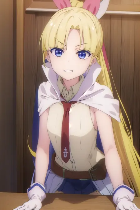 warabi hanasaka, long hair, blue eyes, blonde hair, bow, ribbon, very long hair, hair ribbon, ponytail, hair bow, (parted bangs:1.5),