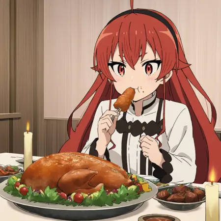 Useful keywords for generation are: Eris Greyrat, Long red hair, Red eyes, black eyeliner, black and white dress, ahoge