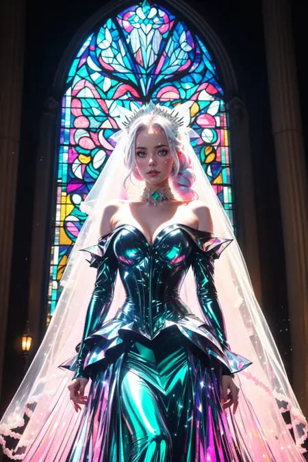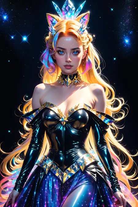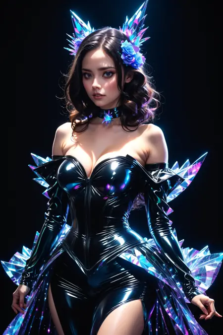 Invoke with dr3ss, (Latex glitch crystal dress) crystal bodice, form-fitting, corruption, jewelry, choker, full length skirt, frills, off shoulder, sleeves