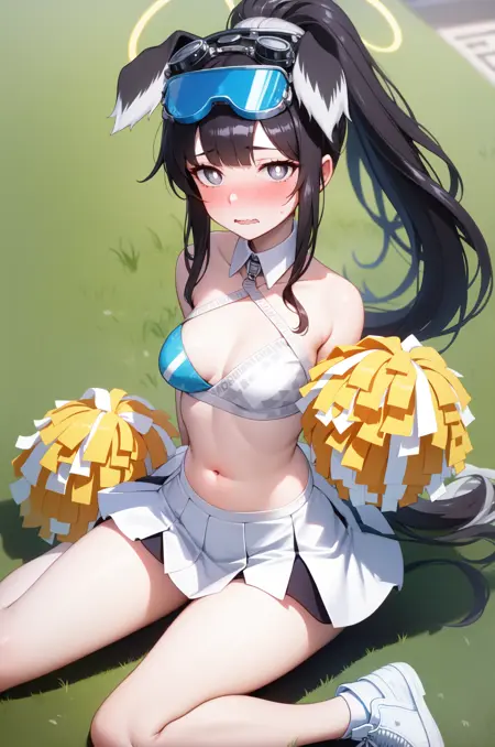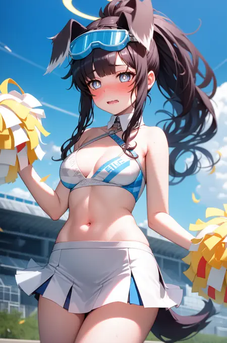 cheerleader: hibiki, grey eyes, bright pupils, wavy hair, black hair, ponytail, sidelocks, bangs, dog ears, dog tail, blue goggles, goggles on head, halo, cheerleader, holding, holding pom poms, pom pom \(cheerleading\), crop top, miniskirt, bare shoulders, white skirt, pleated skirt, wing collar, criss-cross halter,