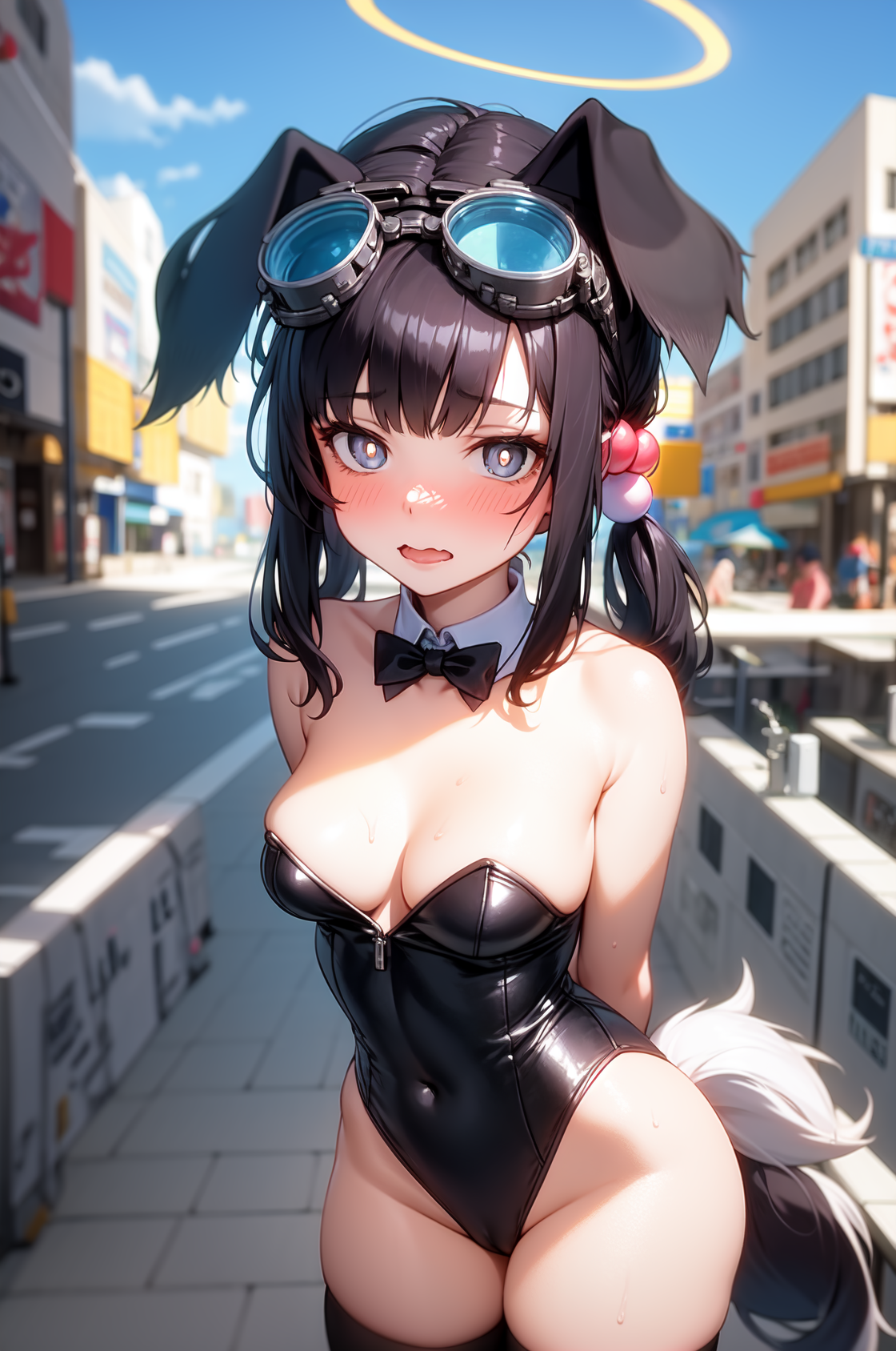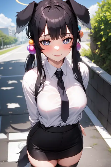 appearance: hibiki, grey eyes, bright pupils, wavy hair, black hair, low twintails, sidelocks, bangs, hair bobbles, dog ears, dog tail, engineering goggles, goggles on head, halo