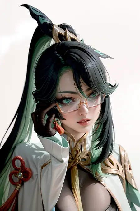 tag:1girl,hair ornament,multicolored hair,very long hair, ponytail,green eyes,red glasses,under-rim eyewear, earrings, tassel,jewelry, capelet, bodysuit, long sleeves, black gloves,long dress,bodystocking,hip vent, clothing cutout,