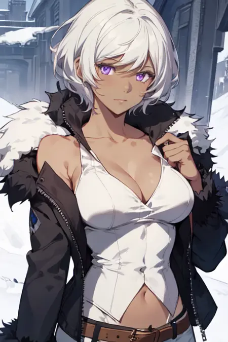 PatriciaHighsmith, 1girl, solo, short hair, white hair, large breasts, white shirt, navel, cleavage, bare shoulders, purple eyes, collarbone, black jacket, belt, dark skin, off shoulder, dark-skinned female, fur trim
