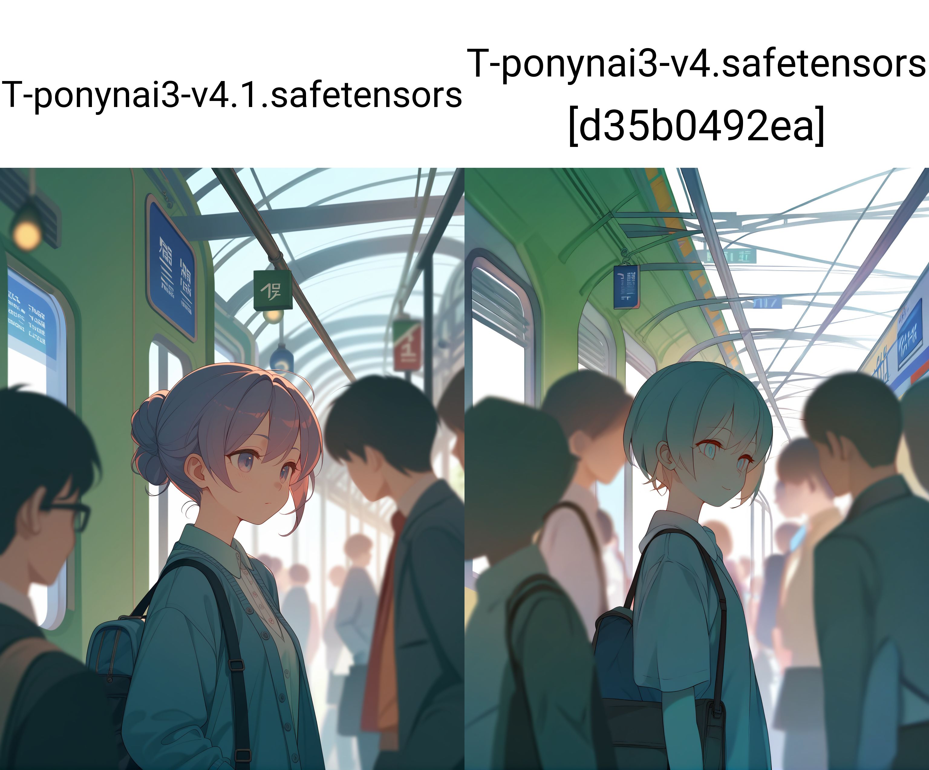 这个版本训练素材减少了,由于v4的失利,所以我开展了另一个项目,以来从一个小的显存占用的角度来测试我的想法,就是训练了四个不同画风的适配于T-ponynai3的画风lora,当然原始模型也上传了civitai。在测试完适配性后,我便开始将这四组不同的画风作为添加剂训练进T-ponynai3-v5。令人惊讶的是,v5的线条质感好了一个大档次,应该是我训练了一个很细腻的素材的缘故,对于这四个画风的打标,我使用了style_1到style_4的提示词,遗憾的是,不知为何,这四个画风并没有各自分开,或者是效果微弱,反而很好的融合进了原始画风。尽管没有达到支持多个画风的目的,但是很好的将原始的nai3画风的质感提升了一个档次,或许下个版本可以尝试更进一步。(我很喜欢打游戏,每次训练的时候不能玩电脑游戏对我来说太难了)