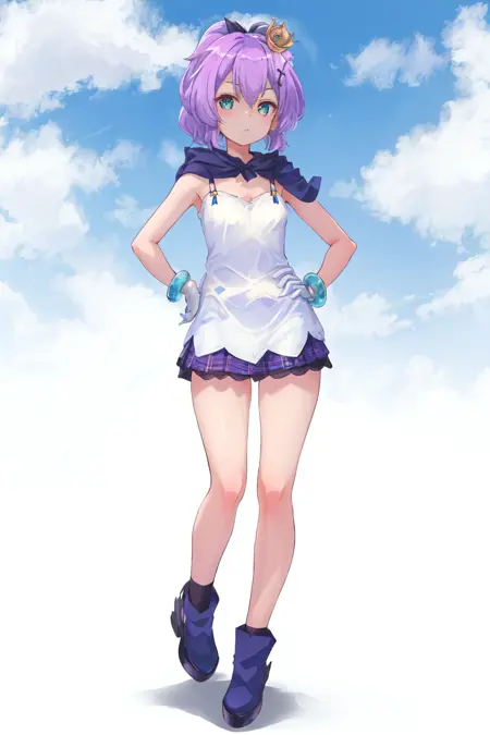 可选提示词:bracelet,white gloves, purple_hair, mini_crown,white_camisole, hair_ornament, black_ribbon, hair_ribbon,blue hood,