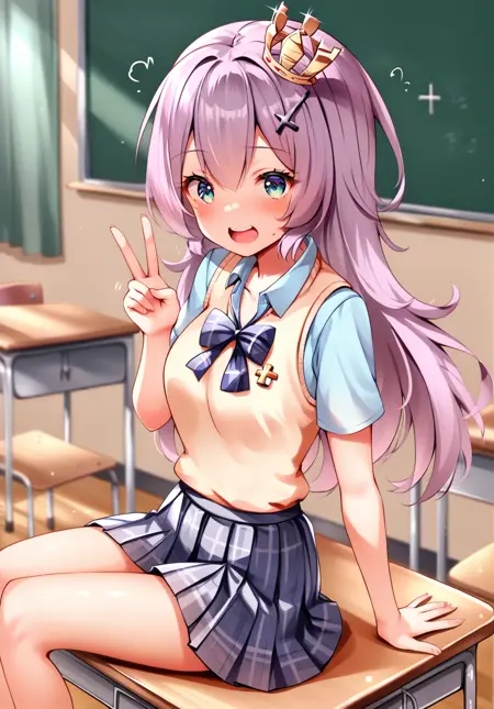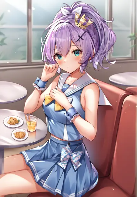校服(slow_ahead!):1girl, solo, purple_hair,mini_crown, ribbon, hair_ornament,blue shirt, jewelry,