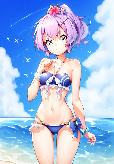 沙滩野餐会(beach_picnic!):javelin_(azur_lane),purple hair,ponytail,hair_flower, swimsuit