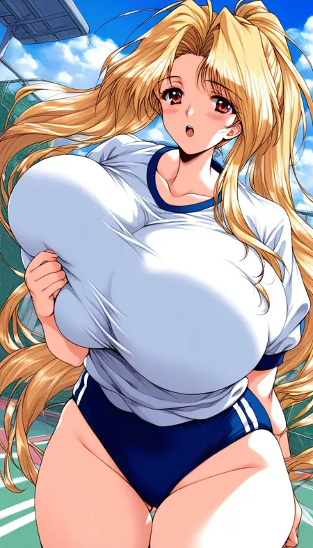 Tracy(XENON), 1girl,solo, blonde hair, Gigantic breasts, brown eyes, red eyes, long hair,