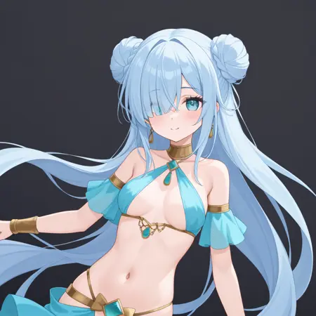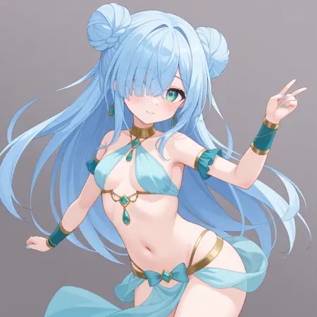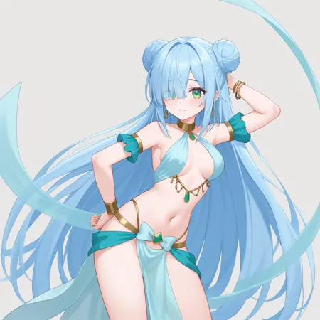 janus_dancer, light blue hair, green eyes, double bun, one eye covered