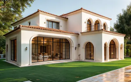 A Mediterranean-style villa exterior, creamy white tones with a contrasting red tiled roof, glass-framed doors and windows reflecting the surrounding greenery, situated in a suburban landscape, radiating a peaceful and cheerful atmosphere