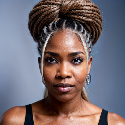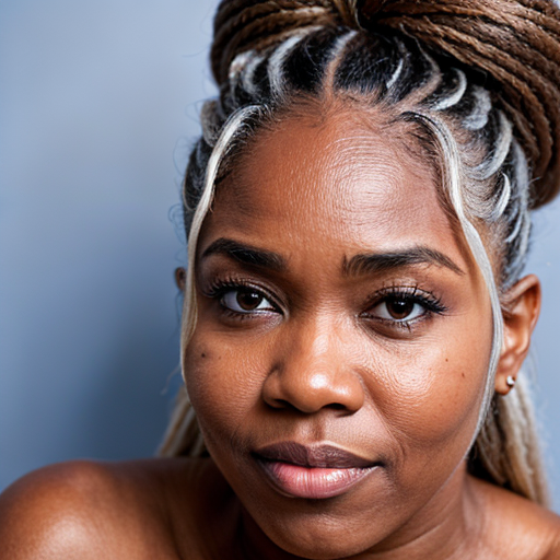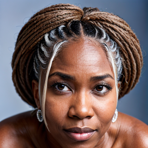 얼굴에 흰 수염이 있는 아프리카 흑인 여성, 머리카락은 회색, 눈은 옅은 갈색