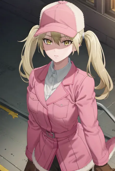 셔츠, 장갑, 모자, 재킷, 흰색 셔츠, 부츠, 바지, 털 장식, 갈색 신발, 야구 모자, 갈색 장갑, 십자 끈 신발, 주머니, 끈 신발, 분홍색 머리장식, 가슴 주머니, 분홍색 재킷, 털 모자, 우샨카, 분홍색 바지,