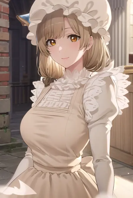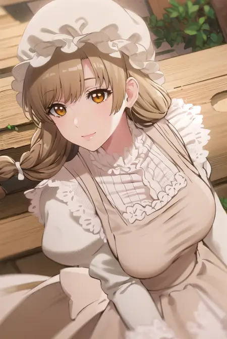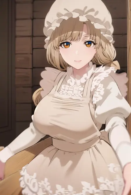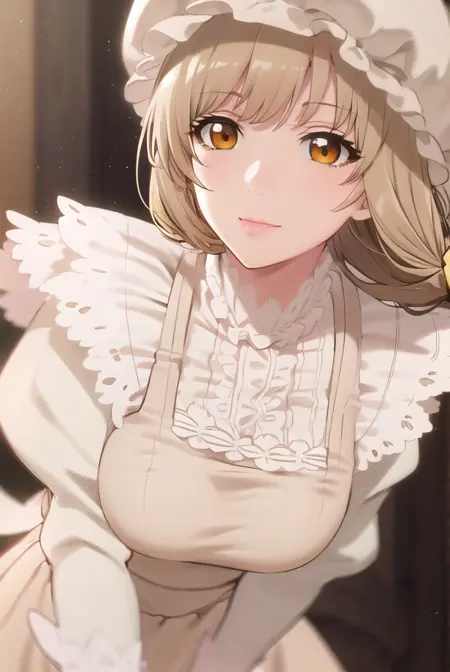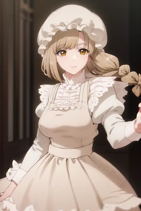 long sleeves, hat, dress, bow, apron, maid, mob cap, maid apron, frills, puffy sleeves, white headwear, juliet sleeves,