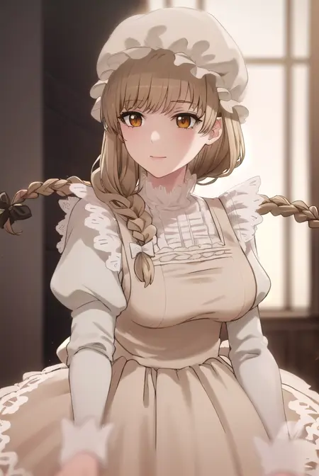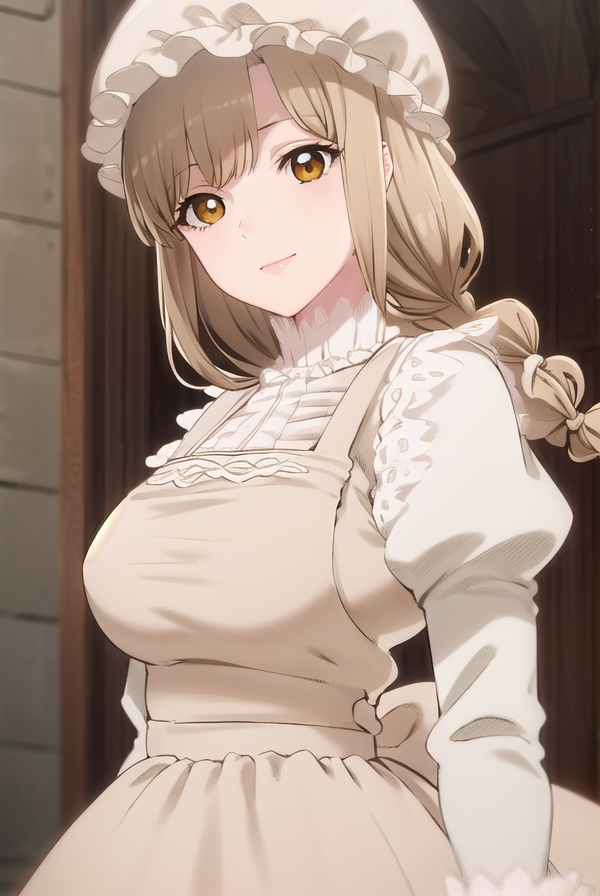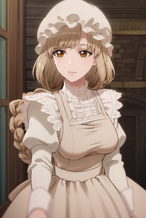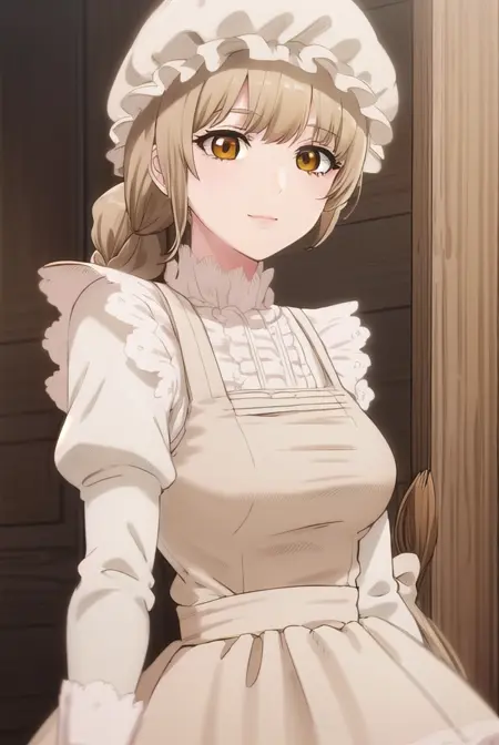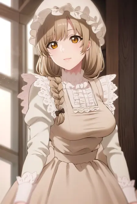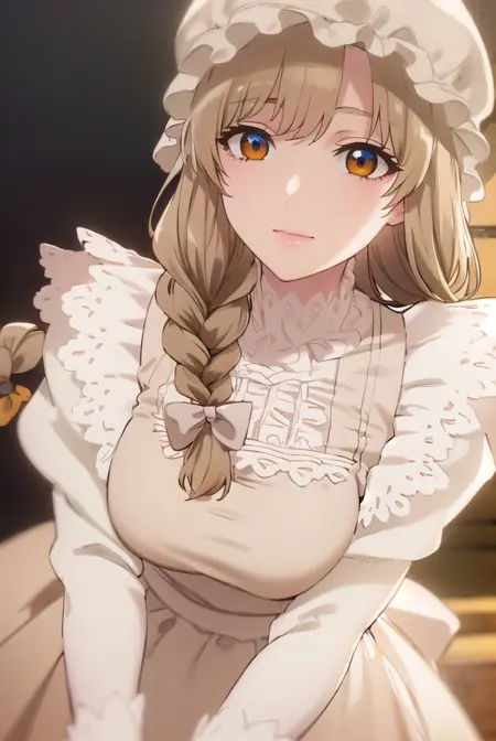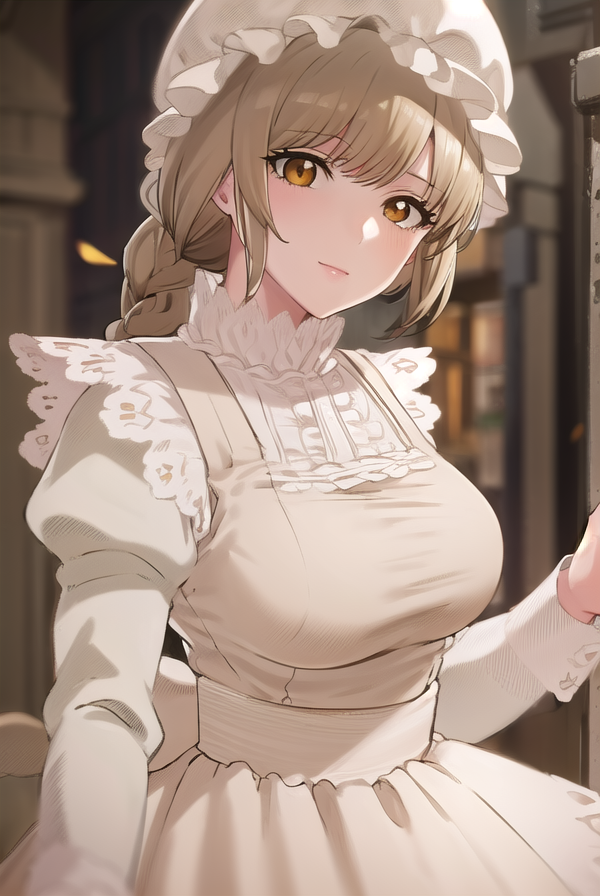 macrophage, long hair, blonde hair, (brown eyes:1.5), braid, braid ponytail,