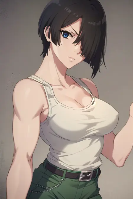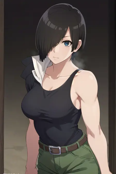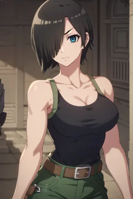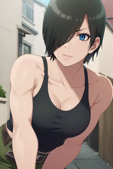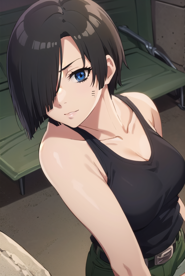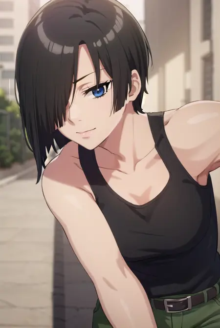 nk cell, short hair, black hair, (hair over one eye:1.5), (black eyes:1.3),