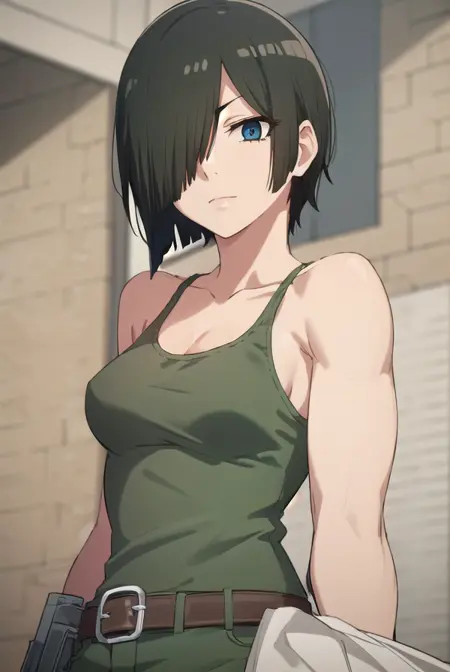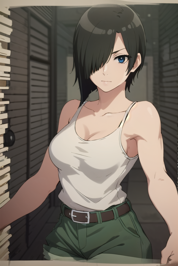 shorts, belt, tank top, green shorts, collarbone, cleavage, bare shoulders, bare arms,