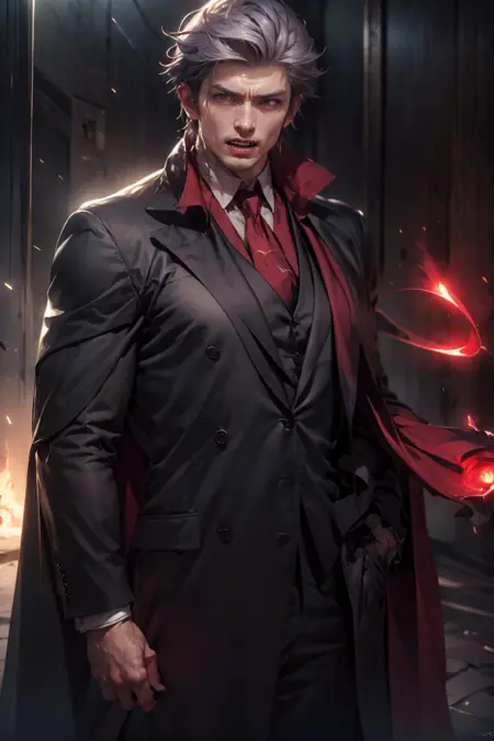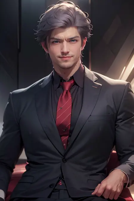1boy, male focus, formal/business suit, red necktie, blue eyes, indoors, black suit, jacket, black coat,