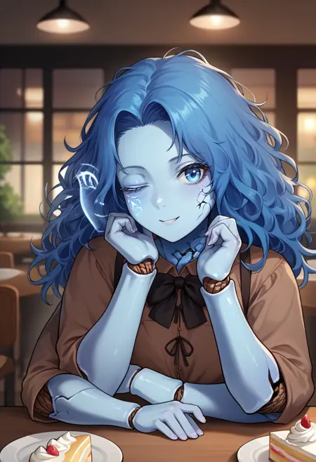 IncrsRnnThWtch, 파란 눈, 한쪽 눈 감음, 파란 머리, 물결치는 머리
