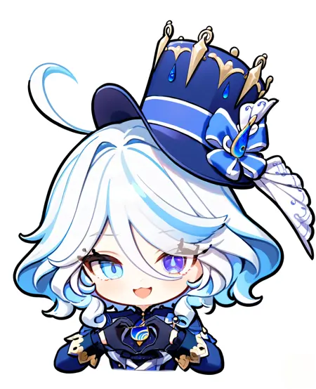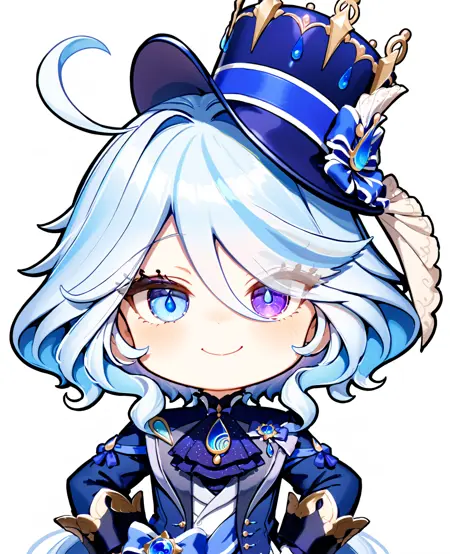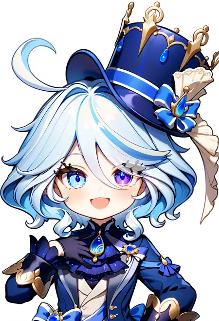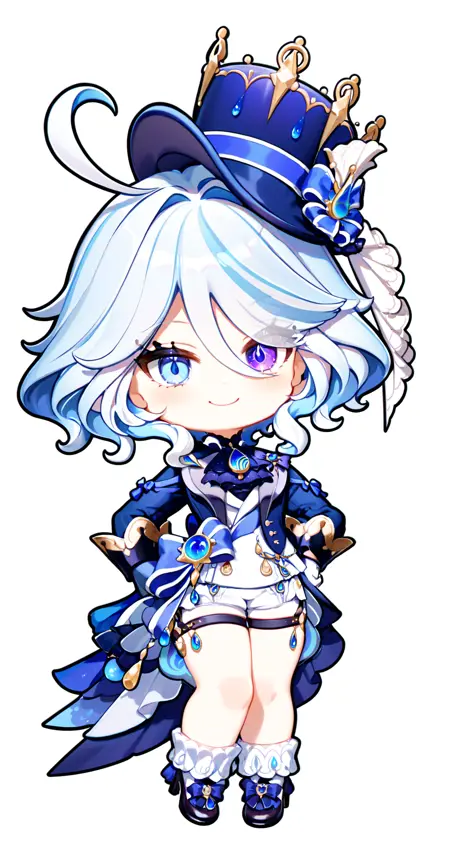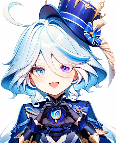 Furina,Top_hat,blue jacket,while shorts,drop-shaped pupils,multicolored hair,ascot,mismatched gloves,streaked hair,jewelry